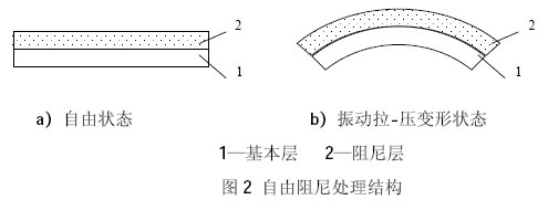 (2)约束阻尼处理 在自由阻尼处理的阻尼层外侧表面再粘贴一弹性层,这一弹性层应具有远大于阻尼层的弹性摸量。当阻尼层随基本结构层一起产生弯曲振动而使阻尼层产生拉-压变形时,由于粘贴在外侧弹性层的弹性摸量远大于阻尼层的弹性摸量,因此这一弹性层将起到约束阻尼层的拉-压变形的作用,所以这一弹性层被称为约束层,而受弹性层约束的阻尼
