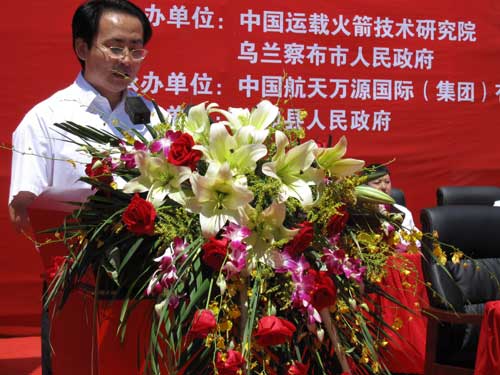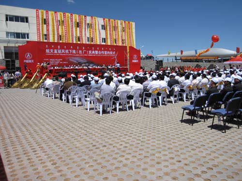 仪式现场 (本网记者 刘汉国)中国航天万源国际(集团)有限公司2009年6月22日在其投资建设的内蒙古中国航天风电产业园举行了航天直驱风机下线(出厂)庆典合作签约仪式。 同日中国航天万源国际(集团)有限公司还与内蒙古自治区乌兰察布市人民政府签署了《风电产业关于发展战略合作协议》,与中国大唐新能源有限公司签署了《在风电领域进一步加强合作之协议》。 内蒙古自治区政府主席巴特尔、副主席赵双连、秘书长乌兰巴特尔,中国航天万源国际(集团)有限公司董事长、中国运载火箭技术研究院副院长韩树旺,中国航天科技集团公司总经理马兴瑞、总经理助理赵晓晨,乌兰察布市市委书记吴永新、政府常务副市长常永福,中国运载火箭技术研究院党委书记梁小虹,中国大唐新能源有限公司副总经理孟令宾等电力公司领导,工程院院士韩英铎教授、施鹏飞教授等知名专家,荷兰EWT公司亚太区代表,设计院、风机协会领导,中央、地方和行业新闻媒体记者等300余人参加了此次航天直驱风机下线庆典暨合作签约仪式。