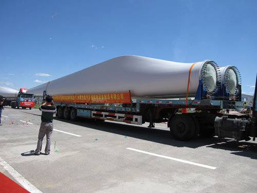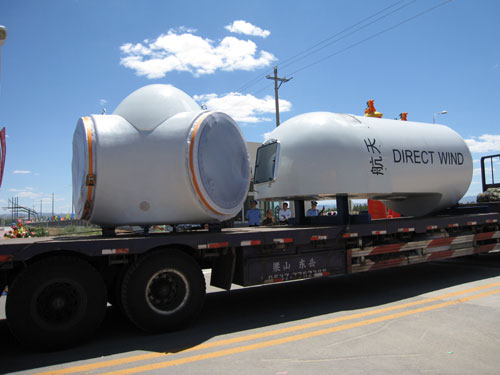 风机部件整装待发 内蒙古航天风电产业园二期工程占地270亩,主要用于2MW永磁直驱风机整机组装、测试及2MW风机叶片的生产,年产能300台套。工程将于2010年投入使用,产业园将逐步实现完整的、自成体系的大型风机总装,风机叶片、控制系统等关键零部件的研发和批量生产能力。此次下线出厂交付的55台900KW直驱风机,将全部安装于中国大唐新能源有限公司开发的乌兰察布市兴和县大西坡风电场。