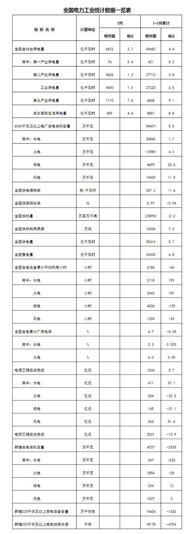 8月19日,国家能源局发布1-7月份全国电力工业统计数据。1-7月全国风电新增装机容量1027万千瓦,同比增长3%;1-7月全国风电投资同比增长51.6%。 注:全社会用电量指标是全口径数据。