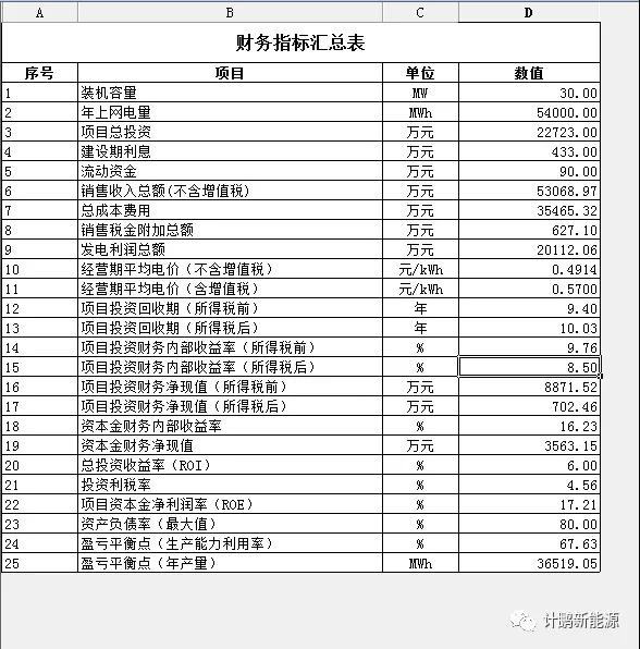 随着风电项目的不断开发,优质风场基本被开发殆尽。现存的可开发风场的风速也越来越低。 根据《低风速风力发电机组选型导则》(NB/T 31107-2017)规定,低风速风场的风速介于5.5m/s-6.5m/s之间。由此可见,超低风速风场的风速区间基本已经在5.5m/s以下了。风速的降低虽然大大增加了风电项目开发的风险,但是这并不意味之超低风速风电场是不可开发的。超低风速风场虽然风速较低,但是其建设条件一般都比较好。 为了更直观的分析超低速风电场开发的可能性,本文利用一个实际项目来进行分析。例如:某30MW平原低风速风电项目,年平均风速在5.0m/s左右,场内道路情况良好,接入条件良好。利用WT软件进行测算,折减系数按照70%考虑,本项目年满发小时数可达1800h。 测算条件: 风机:叶片长度为140m,单机容量为2.5MW; 单位千瓦静态投资:7400元/千瓦。 项目投资测算结果如下图所示: