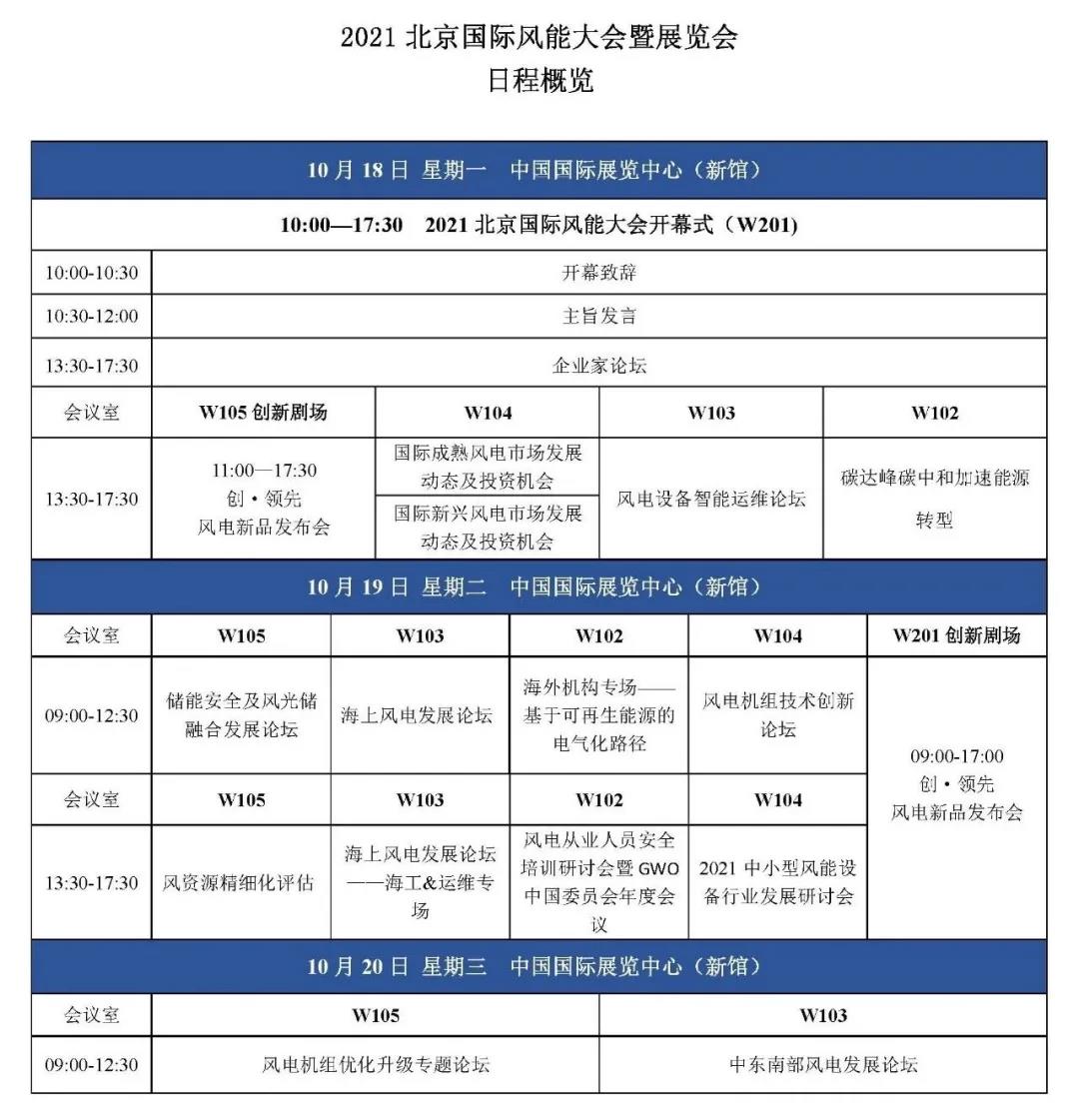 2021北京国际风能大会暨展览会(CWP2021)将于金秋十月在京召开。大会将诚邀全球风能领域专家及产业链企业代表,汇聚国内外优质资源,以产业协同发展及技术融合创新为出发点,从更广阔和更有前瞻性的视角探讨碳中和背景下全球风电发展所面临的机遇与挑战。中外风电同仁将齐聚一堂,探索全球能源转型之路,共谋产业健康持续发展之道。 2021北京国际风能大会暨展览会(CWP2021) 定于10月18日-20日 在北京中国国际展览中心(新馆)召开 以下,为CWP2021日程概览