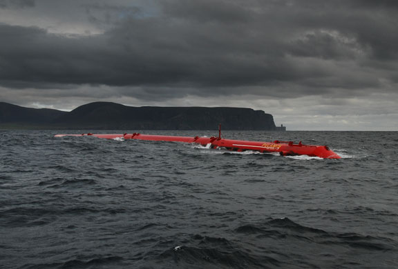 10此海上涡轮机使用名为SeaGen的设备来发电,SeaGen是世界最大的商业潮汐能转换系统,能发出150千瓦的电力。当满负荷运行时,SeaGen的输出功率能达到1200千瓦,可以为1000个家庭提供电力。这是由吉尔·史蒂文森(Gil Stevenson)拍摄的。 11由里查德·耶姆(Richard Yemm)拍摄的这张照片是海蛇(Pelamis)海浪发电设备。在葡萄牙海上的一个海浪发电计划里采用了这一设备。图中的管道长140米,海蛇波浪发电公司耗费了10年时间才制造而成,该公司总部在爱丁堡。