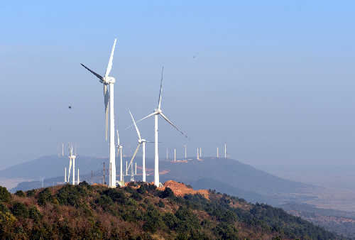 1月14日,在位于江西省九江市庐山区海会镇鄱阳湖滨的长岭风力发电场,山冈上矗立着巨大的风力发电机。 目前,位于环鄱阳湖地区的江西九江市庐山区海会镇、设计装机容量3.3万千瓦的长岭风电场正在紧张建设中,而同为环鄱阳湖风力发电项目首期工程、位于都昌装机容量为3万千瓦的矶山湖风力发电场已经并网发电,这标志着总投资达20亿元的环鄱阳湖风力发电项目初见成效,千年鄱湖风将变成生态能源,改善鄱阳湖岸的生态环境,造福湖区广大群众。据了解,环鄱阳湖地区近期可开发的风电装机容量大约为20万千瓦。新华社记者 章武 摄