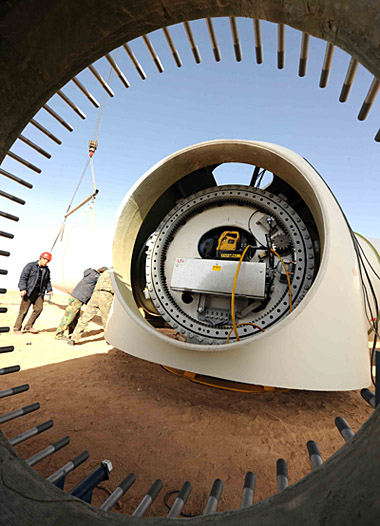 2月8日,施工人员正在内蒙古巴彦淖尔市乌拉特后旗乌力吉风电场吊装风机。拥有得天独厚风能资源的内蒙古自治区按照国家发展新型洁净能源的产业政策,加快环京津大型风力发电基地建设,200多家风电企业在内蒙古追风逐电“抢滩登陆”。截至2009年初,全区风电装机容量突破300万千瓦。