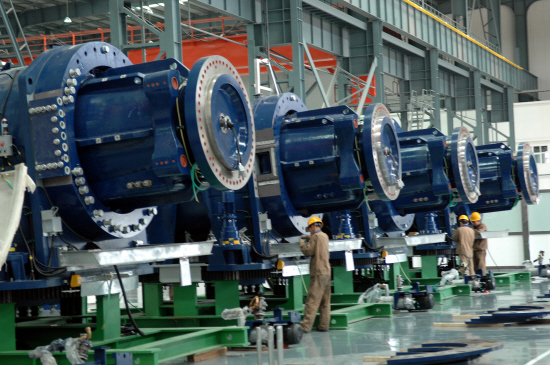 市高新区风电装备产业园正在加快建设。该园以新型风电能源产业为主,分为四大功能区:风电机组总装区、风电设备配套厂区、研发中心及生活配套区。目前风电机组总装区的1.5兆瓦、3兆瓦风电机组总装生产线已投产。风电装备产业园计划用3年时间全部建成,预计实现产值200亿元。图为新投产的华锐风电生产场景。