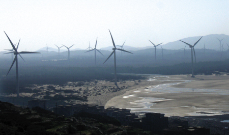 “2009年平潭全年用电量共2.45亿度,而长江澳风力发电场全年发电约2.8亿度,仅每年9月至次年3月的盛风期发电量,就能满足平潭用电,多余电量可送到岛外。其他弱风季节,平潭用电则从岛外调电补充。”长江澳风力发电场副场长林理宁介绍。