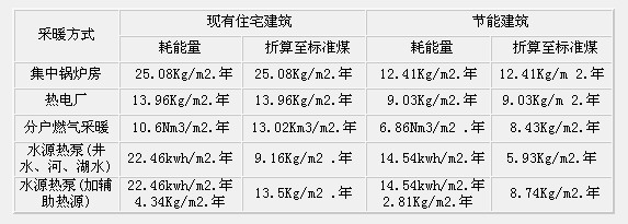 近几年来,水源热泵得以发展的主要推动力是它能够以量大面广的低位热能,如井水、地下 水、江、河、湖水、电厂冷却循环水、矿井水及工业余热等为能源,而且具有热回收功能, 即可利用供冷空调房间排放的冷凝热来加热供热空调房间,从而提高了建筑物内部的能源利 用系数。 一、水源热泵系统的节能性 以采暖运行为例,目前采暖方式有集中锅炉房供热方式、热电厂供热方式、分户燃气采暖方式,水源热泵方式有利用井水、江、河、湖泊水及工业余热的形式;也有利用自来水的冬季要辅助加热的方式。它们的耗能量见表1。 耗能量的比较 表1