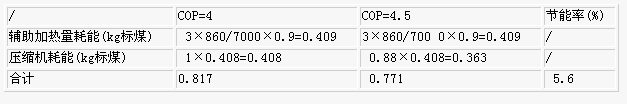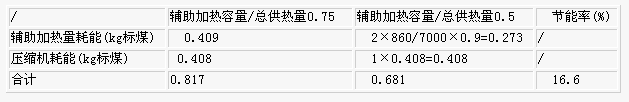 *辅助加热容量为总供热量的75%。 从表2可知,COP从4提高到4.5后,节能率约为5.6%,相当于减少加热容量0.3296KW,即约相 当于减少热负荷10%。 ②.辅助加热器加热容量的影响(见表3) 制热容量为4KW时的能耗* 表3