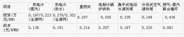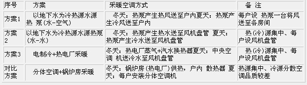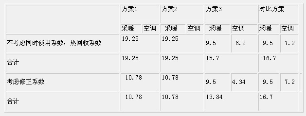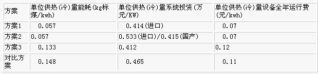 〖BG)F〗 兴隆矿地处兖州市,根据兖州市气象资料,该地区冬季采暖期天数106天,延时小时数2 544小时,最大负荷小时数2544*(20-0.4)/[20-(17)]=1847小时。夏季空调期天数90天, 延时小时数2160小时,根据济南、淄博三联供实际测试资料,取夏季最大负荷小时数为720 小时。则单位建筑面积,采暖期需供热量60W/m2*1847=110.5kwh,空调期需冷量60W/m2* 720=43.2kwh。 各方案综合比较 表8