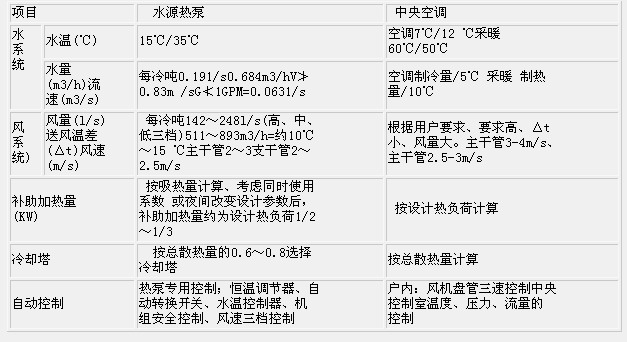 〖BG)F〗 注:[WB]*1机组的送风量为每冷吨0.16m3/s,水流量为每冷吨0.16升/s至0.19升/s。 [DW]*2此时为乙稀乙二醇溶液。 [DW]*3短时间内可以为35/28℃。 水源热泵系统设计时要注意以下几个问题。 ①.水源热泵机组的容量不要过大。中央空调冷热源设备选型时,设备制冷(热)量约为设计 冷( 热)负荷的1.05~1.10。水源热泵机组选型时,应尽量接近设计冷(热)负荷。若机组偏大时 ,运行时间短,启动频繁。机组容量合适,运行时间长,有利于除湿。 ②.封闭水系统水温的选择,夏季要求水温低些,目的是提高能效,降低耗电功率。冬季水 温不要太高,因为水温高时,虽然制冷量高了,但耗电功率也高了,能效系数变化不大。 ③.设计时要考虑采暖空调对象建筑物的同时使用系数。同时使用系数的取值与建筑物类型 有关,与建筑物的数量有关,需通过理论计算和实测确定。《住宅建筑空调负荷计算中同时 使用系数的确定》列出数据是:当住户〈100户时,该系数为0.7;当户数为100~150户时, 为0.65~0.7;当户数为150~200户时为0.6。 五、结束语 从以上分析可知,水源热泵系统是一种可靠、经济、节能的采暖方式。不仅如此, 由于它使用清洁能源,由于它节l效果明显,节能就是环保,在电力已进入买方市场的条件 下,在人民生活条件迅速改善的条件下,水源热泵无疑将是一种受大家欢迎的采暖空调方式 。 主要参考资料 [1]李先瑞、郎四维住宅采暖、空调方式的控讨1999 [2]中国工程院兖州兴隆矿采暖空调联供方案可行性分析报告1999 [3]北京爱华冷气公司美国怡风水源热泵机组1999 [4]张蓓红、蔡龙俊住宅建筑空调负荷计算中同时使用系数的确定 建筑热能通风空调1999.1