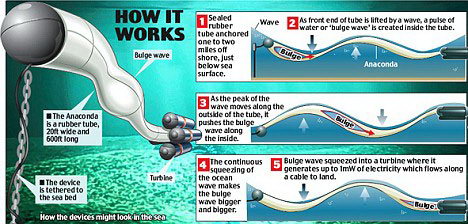 “水蟒”工作原理非常简单:将“水蟒”安装在距离海岸1.6公里-3.2公里远、36米-91米深的水下,并系在海床上,同时使“水蟒”的橡胶管道内充满海水。这样每当有波浪经过时,弹性极强的橡胶管就会随之上下摆动,橡胶管内部就会产生一股水流脉冲。随着波浪幅度的加大,脉冲也会越来越强,并汇集在尾部的发电机中,最终产生电能,然后通过海底电缆传输出去。