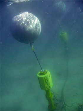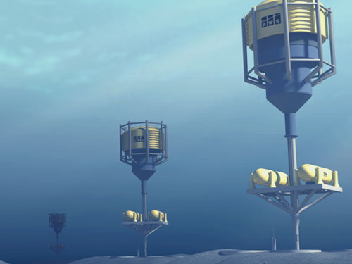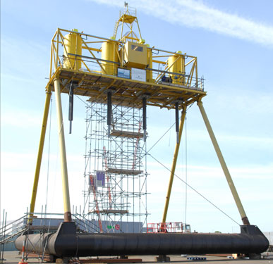 漂浮的平台--这个位于英国的漂浮平台当前正处于“待业”状态,等待2009年晚些时候被部署到东海岸。漂浮平台与立轴相连,立轴将在海浪的作用下上下移动,进而带动与之相连的发电机发电。