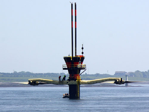 潮汐能涡轮--这个平台名为“SeaGen”,上面装有两个涡轮机。2008年,SeaGen被安装在北爱尔兰斯特兰福特湾的潮流中,可为当地家庭提供1.2兆瓦电量。