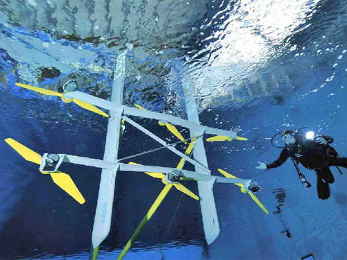 水池测试--这个3米高的支架由英国公司TidalStream制造,最近在法国一个水池内进行测试。最终设计完毕的平台体积将是这个原型的20倍,能够利用潮道中的水流发电。 柱上曼舞 另一种“海浪收割机”立基于一个完全不同的理念——漂浮。对于“海蛇”的接合处以及水力学装置能否在具有腐蚀性的海洋环境下长时间“存活”,英国能源公司Trident Energy的休-彼得·凯利表示怀疑。他指出:“利用海浪发电的最简单方式就是使用附在柱子上的漂浮物,即利用漂浮物的移动带动直线发电机发电。” 即便是立基于这样一个看似简单的想法,最终设计出的发电设备所具有的规模也达到令人吃惊的程度。据悉,Trident Energy设计了一种水翼艇状的漂浮物,可在海浪通过时产生上升力以及推进力。凯利说:“与利用体积相似的传统漂浮物相比,水翼艇状漂浮物产生的能量要高出50%。” Trident Energy设计的“海上浮标”内部装有一个直线发电机——通过磁铁的移动产生电量。凯利表示,他们的水翼艇状漂浮平台每个最高可产生1兆瓦电量,试验安装将于2009年夏季在其位于萨福克郡海岸的第一家海上实验场进行。 水下作业 Trident Energy的其它漂浮物在设计上采用水下作业方式,以避免最恶劣的海上环境。2008年,他们在澳大利亚西部弗里曼特尔附近地区安装了一个漂浮系统。该系统可通过水管将海水泵入岸上水轮机,由于是在岸上,水轮机不会遭受具有腐蚀性和破坏性的海水侵袭。这个漂浮系统名为“CETO”,迄今为止的表现相当不错,第一个商业发电厂定于2009年晚些时候进行部署。Trident Energy表示,一个面积达到5公顷的漂浮物阵列可产生50兆瓦特电量。 现在,让我们的目光再回到北半球的阿基米德海浪发电装置(Archimedes Waveswing),这是另一种位于水下的漂浮物,由英国AWS海洋能源公司设计。每一个“阿基米德”至少要潜入水下6米,上部可像活塞一样相对于下部上下移动。当海浪波峰经过时,活塞向下移动压缩中空结构内部的空气,波谷经过时则向上移动将空气释放出来。AWS表示,被压缩的气体穿过漂浮物内部的发电机;100个阿基米德海浪发电装置所产生的电量可满足5.5万个普通家庭的用电需求。 与潮汐相伴 最近几个月,几个利用潮汐能发电的新设计也进行了水中测试。其中一个是装有两个涡轮机的固定平台,于2008年在北爱尔兰斯特兰福特湾的潮流中安装完毕,可为当地家庭提供1.2兆瓦特电量。该固定平台运营商海流涡轮机有限公司计划于2011年之前,在威尔士海岸安装一个功率更大的潮汐能发电设备,其发电功率将是位于斯特兰福特湾同伴的10倍。 最近,英国公司TidalStream在位于法国布雷斯特的国家海洋开发研究院(IFREMER)测试中心水池内,测试了一个高3米并搭载6个涡轮机的支架。这个支架也是专为潮道设计的,全尺寸支架高度可达到60米,能够产生10兆瓦特电量。 潮汐海浪发电惨遭忽视 TidalStream的约翰·阿姆斯特朗指出,潮汐的潮起潮落相对较为可靠,利用潮汐能发电所能带来的效果绝不亚于风能和太阳能发电装置。然而,虽然后两者的发电量起伏不定,但却获得更大的关注和研发资金。根据英国政府部门“碳信托基金”最近公布的一份报告,海浪能的可靠性同样没有得到应有的重视。 将不稳定的能源——例如风能——引入现有能源格局所遭遇的挑战已经越发明显,在这种形势下,人们对“向海洋要能源”的兴趣不断增长。对于当前测试的一系列海洋能发电设备,究竟哪一个才能成为业内标准,我们仍需对其进行长期考验才能得出一个令人满意的答案。(秋凌)