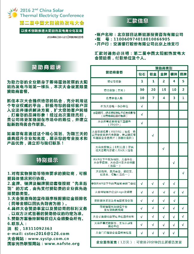 | 2016第二届中国太阳能热发电大会文章来源:国家太阳能光热产业技术创新战略联盟秘书处 | 发布日期:2016-07-06 | 作者: | 点击次数:
