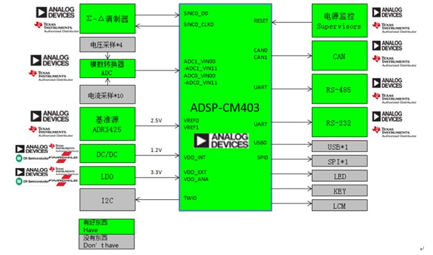 图示2-基于ADI ADSP-CM403 的电力监控方案的功能框图