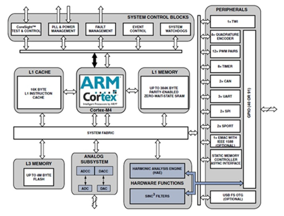 - 2个CAN接口、3个UART、2个SPI、2个SPORT、8个32位定时器、2个双线接口和4个正交编码器接口。