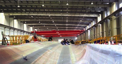 图为该公司宽大的车间正在对新型风电叶片上光检查