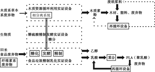 生物质资源循环利用系统的技术开发 一、生物质资源循环利用系统 生物质资源循环利用系统设想如下图 该系统以木质系和草本资源(林地残材、洋麻)以及其废弃物为对象,它由通过相分离系统和以其糖分和旧米食品废弃物等为原料通过发酵回收乳酸,生产生分解塑料—聚乳酸(PLA)的系统或者从糖分生产乙醇的系统构成。木质素酚,PLA都是可返回其利用原材料的化学再循环物质,变为可循环利用,构成了生物质资源循环利用系统。 二、相分离系统:木质素酚的生产技术 这是生物质资源循环利用系统的技术核心,其生产技术概述如下: 1.技术概要 植物生物质总称为木质纤维素,主要由碳水化合物的纤维素,半纤维素以及多酚的木质构成。该技术是用三重大学舩松教授研究出的相分离转换系统,从木质纤维素系原料,以木质素作为植物系分子素材—木质素酚,引导抽提工艺技术过程。该工艺过程的特征:①反应及操作在常温带压中进行;②将木质纤维素中的复杂3次无结构的原木质转换成为可以用二次元使分子量完全一致的木质素酚;③利用木质素再浓缩的无障碍迅速而且高效将纤维素等进行液化•糖化。 2.实证设备概要 ①装置概要。从木粉除去树脂成分,酚被吸着后,加浓硫酸,将纤维素加水分解的同时,使木质进行反应,转换为木质素酚。用离心分离机将其与木质素酚和硫酸糖液分离。木质素酚的不纯物质可利用水及溶液清洗,作为固体回收。 纤维素被加水分解生成的糖分是与硫酸液的混合液体,由备有一边分离硫酸一边回收糖分功能,基乎可全量回收硫酸的子系统分离。所回收的糖分通过发酵,生产乳酸或者乙醇。乳酸或者乙醇通过蒸馏可进行精制除去不纯物质。 ②设备概要。设置场所为北九州若松地区。装置能力:木粉300kg/1批。 3.生物质资源循环利用系统特长 生物质资源是再生资源作为能源,作为物质源(化学工业用原料)引人注目,特别是CO2被评价为中性,从削减的意义被好评。生物质资源循环利用系统在物质回收型资源利用同时,生产物可循环利用,可将生物质吸收的CO2进行半永久固定。亦即通过利用化学循环创造准备,构筑适合于物质循环社会的系统。包含化学循环的“循环利用系统”的构筑,意味着不仅可以固定CO2,而且利用物质可作为原材料被蓄积(被称为固定资本)。生物质说是再生资源,其生产量是有限的,对其进行蓄积可作为资源枯竭的重要对策,该系统从这一观点出发是完全合适的系统。(张焕芬摘自《日本エネルギ学会誌》)