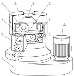 按执行部件的运动状态分,平模制粒机有动辊式、动模式、模辊双动式三种,后两种常见于小型平模制粒机,较大机型一般用动辊式。按磨辊的形状分,又可以分为锥辊式和直辊式两种。直辊动辊式平模制粒机工作原理如图1所示:电动机通过减速箱驱动主轴,主轴带动磨辊,磨辊绕主轴公转的同时也绕磨辊轴自转。加工颗粒时,生物质原料被送入平模机的喂料室,在分料器和刮板的共同作用下均匀地铺在平模上,主轴带动的压辊连续不断地滚过料层,将物料挤压进入模孔,物料在模孔中经历成型、保型等过程,一定时间后以圆柱状态被挤出,旋转的切刀将物料切断,形成颗粒,由扫料板将颗粒送出。