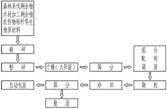 生物质原料主要含有纤维素、半纤维素和木质素等物质,其平模机模辊间的成型机理如下(见图2):供料区内的物料在重力作用下紧贴在平模上,当压辊向前滚动,物料进入变形压紧区,这时因受到挤压,原料粒子不断进入粒子间的空隙内,间隙中的空气被排出,粒子间的相互位置不断更新,粒子间所有较大的空隙逐渐都被能进入的粒子占据。随着压辊继续滚动,被压实的原料进入挤压成型区,部分楔形区、模孔的锥孔部分和前半部分都属于挤压成型区,该区内,压力继续增加,粒子本身发生变形和塑性流动,在垂直于最大主应力的方向被延展,并继续充填周围较小的空隙,由于压辊和物料间的摩擦作用加剧而产生大量热量,导致原料中含有的木质素软化,粘合力增加,软化的木质素和生物质中固有的纤维素联合作用,使生物质逐渐成形,这时部分残余应力贮存于成型块内部,粒子结合牢固但不甚稳定。成型块在挤压作用下进入模孔的保型段,在该段不利于形状保持的残余应力被消除,颗粒被定型。 工艺过程与试验 平模机加工生物质颗粒基本工艺过程如图3所示,生物质原料经过破碎和粉碎后进入干燥环节。水分合适的物料经混合调质后进入平模机制粒。从制粒机出来的颗粒经过冷却和筛分,得到成品,然后包装或者散装出厂。