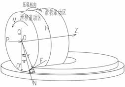 以图4所示的顺时针旋转的压辊为例,平模制粒机工作时,压辊上必定存在一条纯滚动的圆周线H,在纯滚动线H内侧,压辊发生超前性滑动,称之为滑转滚动;在纯滚动线外侧,压辊发生滞后性滑动,称之为滑移滚动。 在压辊与物料接触的任意点A,其受力如图4所示,因挤压物料而收到物料施加给压辊的反作用力N,N大小随 变化而变化,但总是沿半径指向圆心方向;压辊与物料之间还可能存在摩擦力F,F必定沿切线方向,但指向有待讨论。 当机器进入稳态时,压辊处于平衡状态,建立如图所示的柱坐标系,以磨辊轴心为Z轴,磨辊最外截面圆心为Z轴0点,以竖直方向半径为角坐标0点。因平模压辊的自转是从动的,不存在驱动力矩,故其自身力矩之和为零,可以得到其力矩平衡方程: 显然,③式右侧表示滑转滚动区的合力矩,左侧表示滑移滚动区合力矩,两个合力矩等大反向。在滑转滚动区,磨辊因转速较快,相对于物料产生滑动,因此力F沿切线指向上,合力矩方向为逆时针,则由力矩平衡关系可推得,③式左边描述的滑移滚动区所受合力矩必定为顺时针方向,因此该区内的大部受力点所受摩擦力F应沿切线指向下方(如图4所示)。