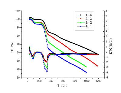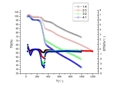 图1为三种样品单独热解的TG和DTG曲线。由图可知,稻秸杆在50℃以上由于干燥和水分析出开始明显的失重;在200℃-400℃主要为半纤维素和纤维素吸热分解使失重速率加快且在325℃达到最大,热解后含碳较少;在大于400℃后,主要为木质素的热解,反应速率较低,热解后含碳较多。另外,无烟煤由于水分、挥发分少,最大热解速率小于褐煤且对应的热解区间也比褐煤偏向高温区。两种煤的热解过程中都出现两个热解效率的高峰。第一个峰值,主要是一次气体析出,此时放出含有C、H、O的化合物;第二个峰值主要为二次气体析出造成,主要是甲烷和氢,量比较的小。与生物质相比,两种煤热解所需要的温度较高,其热解总发生在比生物质热解温度高的区域。 2 稻秸秆与两种煤共热解实验结果及分析 图2是稻秸秆与煤(褐煤及无烟煤)按不同比例混合后热解曲线。可以看出,所有共热解过程主要包括物料干燥、水分析出段和两个热解高峰区。除去在150℃以前的水分析出和干燥阶段以后,共热解曲线明显呈现两个特征区。在350℃以前是以稻秸秆热解为主,在350℃以后是以煤的热解为主。这是由于生物质稻秸秆与煤的不同的热解温度决定的。[NextPage]