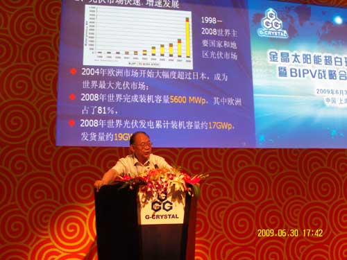 6月30日,金晶太阳能超白玻璃发布会暨BIPV战略研讨会在上海环球金融中心隆重举行,此次盛会由山东金晶科技股份有限公司联合上海市装饰装修行业协会、中国可再生能源学会和中国建筑金属结构协会光电建筑应用委员会(筹)举办,包括美国应用材料、杜邦太阳能、瑞士欧瑞康、日本ULVAC、新奥光伏、无锡尚德、赛维LDK、南通强生、浙江正泰、综艺光伏、绿能科技、宇通光能、德国solarworld等国内外众多知名太阳能光伏设备及薄膜电池生产厂家参加了此次大会。 会上,山东金晶科技股份有限公司总经理曹廷发先生致欢迎词,山东金晶科技股份有限公司营销中心总经理葛风忠做了产品介绍,上海市建筑科学研究院生态建筑研究室主任葛曹燕先女士,中国超高层建筑幕墙资深专家、教授级高工、国务院政府特殊贡献津贴专家席时葭做了有关金晶太阳能超白玻璃在BIPV方面应用的演讲,尚德太阳能电力股份有限公司总经理陈绍斌代表太阳能电池厂家做了发言,上海市装饰装修行业协会会长刘海韵先生,中国建筑玻璃与工业玻璃协会秘书长张佰恒先生,中国可再生能源学会副理事长,光伏分会主任赵玉文先生,中国建筑金属结构协会会长姚兵先生等代表行业协会致辞。会议期间,与会代表就金晶太阳能超白玻璃的优异性能与建筑光伏一体化等议题进行了广泛而深入的交流,达成了广泛的共识。 与会人员表示,在全球能源资源日益紧缺的形势下,作为有志于可再生能源开发和利用的业界人士,理应担当社会责任,肩负起中国光伏产业发展的重任。此次会议为广大太阳能企业和幕墙公司提供了一个交流和沟通的平台,必将促进中国光伏产业特别是BIPV的良性发展,相信以此次会议为起点,中国的光电建筑一体化的应用将得到快速的发展,太阳能超白玻璃等相关材料的应用前景将更加广阔。 金晶太阳能超白玻璃是山东金晶科技股份有限公司为响应国家节能减排和大力发展新能源的战略部署和政策要求,通过技术攻关和自主创新所成功研发并批量生产的目前国内技术最为成熟的太阳能超白玻璃,已先后通过了相关权威部门的技术验证。金晶太阳能超白玻璃因其较高的太阳光透过率和良好的机械性能,被广泛应用于非晶硅薄膜电池、晶体硅电池封装盖板、太阳能集热板、太阳能热水器、太阳能光伏建筑等所有太阳能光伏领域,目前已远销欧美十几个国家,金晶太阳能超白玻璃已成为金晶科技继建筑类超白玻璃之后走向世界的另一张通行证。