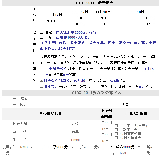 【中国国际显示大会(CIDC)】在工信部、广东省经信委、深圳市产业主管部门和有关领导的大力支持下,经过前九届的努力和积累,已发展成为中国大陆地区规模最大、最具代表性、并在世界范围内有广泛影响力的平板显示行业盛会。为此每年举办的CIDC均受到了业界极大关注,在继前九届成功举办之后,于2014年11月17-18日在深圳继续召开“第十届中国国际显示大会CIDC 2014”。平板显示产业的发展是人们生活现代化日益提高最明显的体现。随着科技在生活中的广泛应用和发展,高科技产品与人类的生活关联性日益增强。本届大会将围绕“中国平板显示产业发展趋势与最新政策解读”、“未来柔性电路发展趋势”、“新型玻璃的未来发展”等行业最新热点话题,讨论科技预测商机的同时为您呈现未来生活的美好蓝图。 【CIDC 2014】 主题:“技术的延伸、显示的未来” 时间:2014年11月17日-18日 地点:深圳会展中心 语言:中英同声传译 【CIDC 2014亮点】 ★华星光电、德国默克、日本松下、日本显示等行业巨头预测国内外光电平板发展趋势; ★亚洲平板显示产业权威首次高峰对话,畅谈合作之机会; ★聚集全球平板显示行业泰斗、知名专家分享成功行业经验; ★亚洲平板显示产业发展交流大会,一站式双向采供销平台; ★聚焦光电平板产业最前沿的产品、技术,探讨液柔性技术、触摸屏产业发展与前景; ★高峰圆桌峰会被业界视为全球FPD产业最高规格的顶级特色会议; ★国际性行业盛会,是“第十六届高交会”重要内容之一; ★预计600名业界高层、行业泰斗、工程师、高级采购商参会。 【CIDC 2014商机】 ◆与日韩采购团采购商一对一洽谈,寻找目标客户,达成订单; ◆零距离接触600名业界高层和同行,拓宽行业人脉; ◆捕捉光电平板行业发展趋势,为企业决策提供依据; ◆曝光全球主流媒体,提升企业和产品知名度; ◆海峡两岸平板显示产业发展交流大会,采购,供应兼顾; ◆整合营销,媒体,协会,同行,采购商密集关注; ◆了解海峡两岸最新行业资讯、技术和产品; ◆吸引全球主流媒体聚焦,提高企业曝光率,提升企业品牌形象。 【CIDC 2014议程点精】 ² 未来柔性电路发展趋势 ² 大尺寸面板制作最新技术 ² 柔性显示技术的最新进展 ² 光学膜在显示技术中的最新应用 ² 中国触控产业的发展趋势 ² 全息显示触控的最新技术与应用 ² 新型玻璃的未来发展 ² 触控IC的最新应用 ² 蓝宝石VS玻璃 ² 移动终端与可穿戴器件的未来发展 .......欢迎联系组委会了解详细会议议程 【CIDC 2014参会费用】 【CIDC 2014组织机构】 主办单位:第十六届高交会组委会 协办单位:中国电子视像行业协会/中国光学光电子行业协会液晶分会/广东省半导体行业协会/深圳市平板显示行业协会/深圳市平板显示行业协会触摸屏分会 支持单位: 国家工业和信息化部电子信息司/广东省经济和信息化委员会/深圳市发展和改革委员会/深圳市经济贸易和信息化委员会/深圳市科技创新委员会 承办单位:深圳市亚威会展有限公司 支持媒体:《国际光电与显示》/《国际光电与显示触摸屏》/《平板显示文摘》/《液晶与显示》/《深圳平板显示简报》/中华全触网/中华显示网 CIDC 2014组委会执行办公室: 地址:深圳市南山区科技园北区朗山2号路豪威大厦4楼 联络人:王健 电话:0755-86149083 传真:0755-82968771 E-mail: wjkkk520@163.com