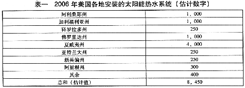随着太阳能利用政策在美国大踏步的发展和实施,人们对太阳能热水器这一首先投入商业应用的太阳能技术的认可正在不断提高。这是一项已被实践证实了的低成本而高效益的太阳能应用技术。事实证明它能减少用户对燃气热水器的信赖性,因而也大大减少了温室气体的产生,并节约了用户每月的耗能费用开支。即使在多云气候地区,太阳能热水器系统都可以在不足十年的时间内回收它们的成本。 在世界范围内,每年都有数百万户家庭安装和使用太阳能系统,为住宅提供生活热水和采暖。许多在国外的著名太阳能设备厂家都十分注视美国这个市场。目前,不少国外生产的太阳能集热器和系统产品正在轮候通过美国太阳能设备评级与检验机构(srcc-solar Rating and certifcation corp)的审定,以便进入美国市场。然而,与其他发达国家相比,美国仍然缺乏足够的公众政策来鼓励民众使用太阳能热水系统。 其实,早在十九世纪后期和二十世纪初期,太阳能已经是佛罗里达州和加利福尼亚州居民用以加热热水的方法。直到油料的取得变得容易和使用燃油得到普及之后,人们才较少使用太阳能。但是,到了二十世纪七十年代初出现了石油禁运和其后的油价暴涨的危机,人们的注意力又重新转回新能源的应用,以帮助国家渡过这个危机。州和联邦选择用以鼓励民众开发和使用太阳能的主要政策是税收优惠。安装和使用太阳能的住户可以从中吸取巨大的利益。例如在加利福利亚州,用户可以省下70%的太阳能系统成本。 表一列出了2006年期间美国各地安装太阳能热水系统的规模,这是对美国国内市场的最佳估算值。从表中看出,在全美范围内总共有大约8500个这样的系统。或许,相对于全世界安装太阳能热水系统的规模来说,这人数字似乎微不足道。然而,应该看到:按每个系统产生相当于2KW传统能源的能量计算,8500个系统将产生高达17MW的热量,这相当于一个巨大的传统发电量。 事实上,太阳能热利用技术在美国已经被认可,成为了一个利润可观的专业化市场。人们已经把它看作生活中一个重要部位,因为它能使生活更加舒适。比如,用太阳能来加热游泳池就是其中的一个例子。每年太阳能游泳池加热系统的销量多于50,000套,而且每年都在稳定增长。从1995年算起,到了2005年,太阳能游泳池的面积突破了一亿平方英尺,达到了一个新的里程碑。 另外,太阳能热水系统技术对抑制全球气候改变也同样起着重要作用。美国可再生能源国家实验最近的报告指出:从节约能源、降低能源成本和减少温室气体排放的观点来看,太阳能加热热水是太阳能一种众望所归的利用。在2006年,太阳能热水系统在住宅和商用楼宇的应用替代了美国当地380万兆瓦一小时(WMh)的电力消耗。这个电量相当于大约35.5万户家庭一年的电力需求。同时,太阳能热水系统的应用还减少了住宅和商业楼宇对美国天然气的需求。仅在2006年就减少了49亿立方英尺天然气的消耗。就以上两项节省下来的电力和天然气而言,太阳能热水系统就已经避免了近6000吨氮氧化物(NOx)、11,500吨二氧化硫(SO2)和270万吨二氧化碳(CO2)的排放。由此可见太阳能热水系统的大力推广将会有效地抑制温室气体的排放,从而有效地抑制全球气候改变。这同时也是太阳能热水器再次在美国市场兴起的原因之一。 游泳池加热系统。在美国国内,每年安装的太阳能游泳池加热系统大约有50,000套。 表二2002年全球范围内用于太阳能热利用的集热器面积及世界各国所占的比例
