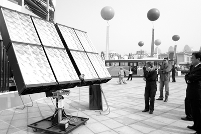 随着全球化石能源的日渐枯竭和人类环保意识的增强,以光伏为核心的太阳能发电事业近年来有了飞速的发展,高倍聚光太阳能光伏发电技术应运而生。该技术在大幅度减低太阳能电站成本和迅速实现大规模生产方面具有很大的优势,弥补了一般太阳能电池板对蓄电池充电时,必须在强光照射下才能发出足够的电量进行充电和充电时间相对较短的不足。 图为2008中国北京节能环保展览会上,高倍聚光太阳能光伏发电技术备受关注。