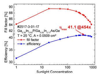 图二、填充常数,效率与太阳集中常数作图(数据由FraunhoferISECalLab量测) 去年FraunhoferISE将转换效率由37.6%提升至39.7%通过调整前端金属细线的接触结构具有较低的阻值可以传递较大的电流,因此比较适合太阳集中常数300~600。法兰克提到,最新的电池则改变前端金属细线的图形,并具有较佳质量的膜层。为了让整个技术与现有技术般具有竞争力,迅速且可行,FraunhoferISE与德国海尔布隆(Heilbronn)的AzurSpace共同合作,并技转同样位于弗莱堡的ConcentrixSolarGmbH。“与其它聚焦型光伏系统相比,我们的高效率太阳能电池是降低发电成本最有效率的方法”FraunhoferISE的所长安德鲁贝特博士(AndreasBett)提到。FraunhoferISE藉由新的高转换效率电池往目标迈进一大步,很快的,光伏发电的成本便可与传统发电竞争。 法兰克博士认为经由改变电池的结构将有助于使这类型电池具有长远的优势,并使效率提升至42~43%。过去15年FraunhoferISE的研究员致力于III-V族多接面太阳能电池应用于聚焦型光伏系统的研究,由初期德国联邦教育研究部(GermanFederalMinistryofEducationandResearch,简称BMBF)的支持,如今同时获得德国联邦环境、自然保育暨核子安全署、智慧能源决策局(GermanFederalMinistryfortheEnvironment,NatureConservationandNuclearSafety,简称BMU)提供金援,作为博士生的奖助学金,未来,将以更快更好的研究结果与世人分享。