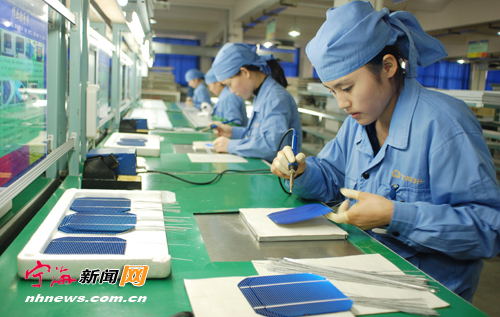 宁海新闻网讯 (记者惠广亮 通讯员储芬芳) 昨日,宁海县日升电器有限公司工人正在组装生产太阳能电池片。该公司克服汇率和原材料波动、劳动力成本增加以及用地瓶颈等制约,自2006年转型生产太阳能电池片以来,销售收入从1亿元发展到9亿元,奇迹般地实现了几何级翻番,今年有望突破15亿元。