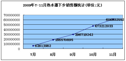 2009年5月,太阳能热水器产品跨入了家电下乡的大门。在这次招标工作中,共有92家企业、806款产品中标太阳能家电下乡。据商务部公布的家电下乡统计数据显示,截止到2009年11月,太阳能、电、燃气热水器的累计销量为830106台,累计销售额16.56亿元。 随着太阳能热水器销售旺季的到来,2009年7-11月热水器产品下乡销售额不断攀升,其在整个家电下乡产品销售额中所占的比重也从7月份的0.71%跃升为11月份的8.3%。