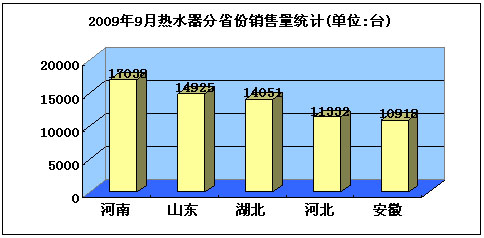 2009年9月热水器省份销售量统计 从分企业销售量统计情况上看,以商务部公布的9月份数据为例,除占据销量榜第一位的海尔销售量为40373台,占据了28.27%的比重外(此统计数据包含太阳能、电、燃气热水器三种产品)。居第二至第四位的皇明、桑夏、太阳雨销售量差距并不大。而其后第五至第九位的企业销量差距更为微弱。这与其他诸如冰箱、彩电、洗衣机等下乡产品一家或几家独大的局面形成了鲜明对比。体现出了太阳能热水器市场集中度低,企业竞争激烈的特点。[NextPage]