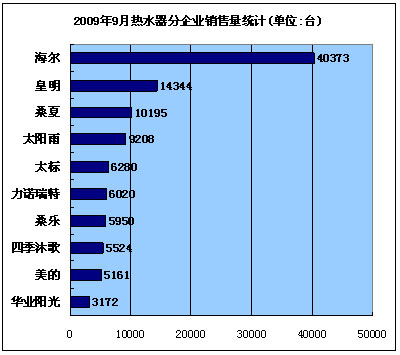 2009年9月热水器分企业销售量统计 2009年,在家电下乡等国家政策的扶持下,太阳能热水器产业获得了前所未有的发展。据初步统计,09年行业总产值已突破500亿元大关,太阳能热水器年产量突破4000万平方米,太阳雨、桑乐先后宣布突破年产热水器百万台。 海尔太阳能事业部营销总监刘刚表示:“2009年6至10月,海尔共销售364699台家电下乡产品,其中太阳能热水器占到了31%。,家电下乡短期内仍是三四级市场增长的主要推动力量。” 太阳雨集团营销总经理陈荣华也坦言:“太阳雨80%的市场在农村,太阳能热水器纳入家电下乡产品范围对于太阳能行业是个极好的机遇。”同时他也表示:“家电下乡给企业带来的不仅仅是利润,整个产业的健康发展才是最终目的所在。” 2009年岁末,当太阳雨、力诺瑞特等企业的身影出现在2010年央视黄金广告招标现场,当越多越多的太阳能企业投身到公益事业中,随着企业的不断壮大,企业责任感的提升,人们印象中太阳能企业的形象正在发生改观,而整个太阳能产业正在向着更为规范和健康的方向发展。 2010年1月,新一轮家电下乡招标工作即将展开。在这次招标工作中,太阳能热水器产品的最高限价由4000元提升至5000元,将有更多的太阳能企业和太阳能产品投入中家电下乡的市场中来,未来的2010值得我们共同期待。