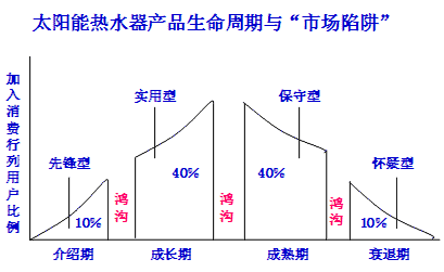 (引言)受益新农村建设和家电下乡政策,中国太阳能光热产业在前期的疾速膨胀之后突然转向低迷,今年以来市场销售一路下滑。在行业品牌集中度加速上扬的进程中,太阳能品牌要如何作出战略调整,成功跨越产品生命周期中的隐形“鸿沟"进行自我救赎? 在全球金融危机最严峻的时期,太阳能热水器产业却逆势飞扬。2009年中国太阳能热水器行业产值达到创纪录的630亿元,增长速度达46%。以至今年初行业专家一致看好市场前景,2010年太阳能热水器销量必将超越往年的言论不绝于耳,许多太阳能企业负责人均对今年的市场走势给予了“看涨"的表态,一些企业甚至提出了产销劲增一倍多的目标。然而,从行业传统的3-6月旺季期的市场实际表现来看,今年却并没有出现往年的“金三银四", 许多市场成交量一路快速下滑的惨状令人始料未及,“望阳兴叹"之余,部分企业不得不关门停产,知名太阳能品牌在央视黄金时段的广告投放也嘎然而止。 对于国内整个太阳能热水器的市场销售出现群体性下滑的现象,行业观察专家各抒己见,言人人殊。有“缓慢增长"说,市场需求从井喷步入盘整阶段,虽然总量仍保持着一定增长,但增速已大幅放慢;有“僧多粥少"说,农村太阳能市场的蛋糕是稳定的,但“吃蛋糕的人"增加了许多,这自然会出现销量下滑;有“极端天气"说,今年春节后较为恶劣的极端性天气对市场造成了极大的影响……专家观点毋庸置疑,扭转销量下滑的解决方案仍悬而未决,企业心急如焚于苦无良策。太阳能热水器行业究竟遇到了怎样的瓶颈?面对突如其来的行业危机,太阳能热水器企业又该何去何从? 忽视“鸿沟"导致销量陡然滑坡 在太阳能热水器市场刚性需求强劲的前五年,市场保持着旺盛的增长势头,短期内推动了国内一大批企业的快速发展。行业内许多企业迅速扩大生产规模,加大市场宣传的力度,连非家电领域的不少企业也染指太阳能热水器,可是等这些投资到位之后,本来期望能带来更大的收获,但市场整体需求却稳定在一个低水平上,个别区域市场甚至莫名其妙地下降。经过深圳双剑破局营销策划机构对太阳能热水器市场调研后,发现了问题的根源:太阳能热水器的产品生命周期并不是一条连续的曲线,该产品的生命周期中有三个“鸿沟"存在,当前之所以销量会停止不前,甚至销量衰落的速度出人意料的快,就是遇到了第一个“鸿沟"。 传统的市场营销理论告诉我们,一类产品的生命周期总是经历介绍期、成长期、成熟期和衰落期四个阶段。尽管有的产品生命周期长一点,有的短一点,但是总有一个同样的规律。基于这样的理论,多数人会认同当前的太阳能热水器处在成长期阶段。这个阶段的典型特征是消费者对产品已经非常熟悉,大量的新用户加入消费行列,市场逐步扩大,厂家也步入销量和利润双丰收的滋润期,而市场的现实情况却是另一番景象。为了深入地了解太阳能热水器遭遇的第一个“鸿沟",我们不妨从该产品用户的类型入手进行分析。我们把用户分成四大类,第一类称为“先锋型",第二类称为“实用型",第三类称为“保守型",第四类称为“怀疑型"。现在我们来看一下前两类用户在消费动机、消费特征方面有哪些方面差异。 [NextPage]
