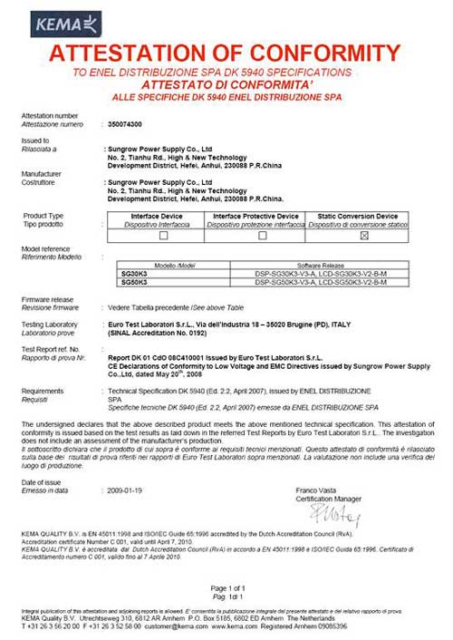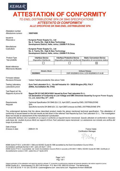 近日,从意大利传来喜讯,合肥阳光电源有限公司的系列光伏并网逆变器圆满通过EuroTest测试机构的严格检测,顺利获得意大利电力系统的DK5940准入认证,成为中国国内电源行业首家通过此类认证的企业。 SG30K/SG50K SG100K3 SG250K3 SG500KT 欧洲太阳能光伏市场潜力巨大,而意大利是一个新兴的光伏市场,但其准入门槛较高,光伏并网逆变器进入意大利,除了欧盟常规认证外,还必须符合意大利本国电网的认证许可。DK5940是意大利颁布的针对本国并网发电系统的标准法规,对接入电网的产品并网时必须满足的电压、频率、直流分量、谐波和安全等项目提出了较严酷的要求。 为此,阳光电源成立了项目组,对原有产品进行了升级改进,并选择了意大利最著名的测试机构—EuroTest实验室,他们严格按照DK5940标准的要求,对阳光电源的SG30K3、SG50K3、SG100K3、SG250K3、SG500KTL等光伏并网逆变器进行了多项性能测试,特别是进行了在高温(环境温度55℃)、高湿(相对湿度93%)下的严酷测试。测试结果表明阳光电源逆变器表现优异,完全满足DK5940标准的各项要求,顺利拿到了认证证书,为阳光电源的产品进入意大利市场铺平了道路。 这是阳光电源继获得CE、TÜV等认证之后取得的又一国际权威认证,更加坚定了海外客户对阳光电源产品性能和质量的信心,也加快了阳光电源拓展海外市场的速度和步伐!