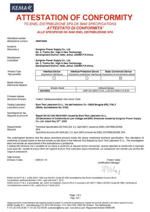 阳光电源并网逆变器获得意大利电网准入认证文章来源:阳光电源 | 发布日期:2009-02-06 | 作者:未知 | 点击次数: