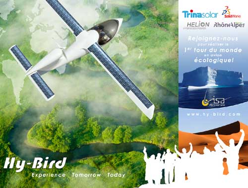 继丽莎航空与天合光能2008年第一次合作成功后,2009年,两家公司继续推进合作关系。基于共同的环保理念,两家公司将继续在Hy-Bird项目, 一种通过由太阳能和氢能提供动力来源的飞机上强强联合。 作为世界知名的太阳能电池与光伏组件制造商,天合光能将为丽莎航空提供1100片单晶电池。 安装在飞机机翼和尾翼上的光伏电池将在飞行和着陆的时候对锂电池进行充电,除了巡航飞行时所需的燃料电池以外,这些锂电池将提供给飞机起飞和续航所需的能量,这些来源不同的清洁能源会使飞机在高空状态下比传统燃料引擎更安静,更具效能。