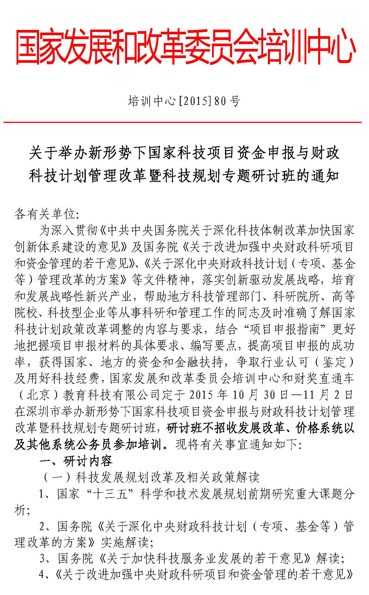 关于举办新形势下国家科技项目资金申报与财政科技计划管理改革暨科技规划专题研讨班的通知文章来源:jnjp105@163.com | 发布日期:2015-10-19 | 作者: | 点击次数: