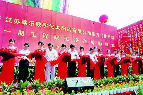 6月29日上午,江苏桑乐数字化太阳能有限公司百万台生产线一期工程竣工投产剪彩仪式在淮阴市经济开发区隆重举行。中国太阳能热利用产业联盟执行理事长、中国农村能源行业协会太阳能热利用专业委员会主任罗振涛,全国太阳能标准化技术委员会秘书长贾铁鹰,中国资源综合利用协会可再生能源专业委员会主任朱俊生,淮阴市委常委、纪委书记孙健,山东科学院党委书记李海舰,副院长姜笛,能源所党委书记、桑乐集团总裁高靖平等一起出席并为项目竣工剪彩。