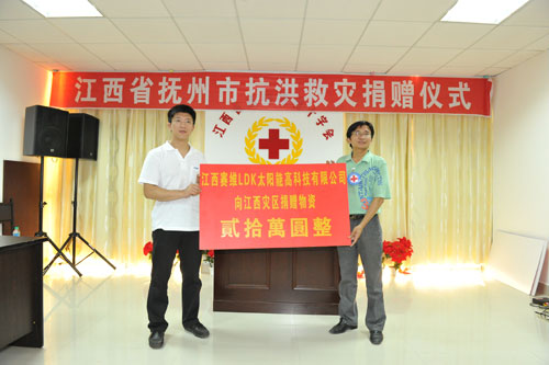 物资 近日,赛维LDK组织了一支由公司内部志愿者构成的团队奔赴江西抚州抗洪赈灾。 6月30日,赛维LDK在其集团总部办公楼前举行了简短的欢送仪式,董事长彭小峰代表公司欢送志愿者一行并预祝此次赈灾行动取得圆满得成功。赛维LDK此次捐赠物资价值人民币20万元,主要有太阳能手电筒、方便面、矿泉水、棉被等生活用品。 连日来,江西抚州灾情牵动千万人心,在得知灾情后,赛维LDK在第一时间便作出反应,公司高层立刻召开紧急会议商讨抗洪赈灾事宜,并很快作出了组团奔赴灾区现场赈灾的决定。为了帮助灾区人民尽早解决日常生活问题,赛维LDK在很短时间内便组织了一支由公司志愿者构成的抗洪赈灾团,并集中购买了大量灾区急需物质。特别考虑到部分灾区目前供电不正常的问题,赛维LDK还在救灾物质中增加了1000个太阳能手电筒。据悉,此类太阳能手电筒只需在太阳下就能获得持久的电能,它的使用将给灾区人民的生活带来便利。